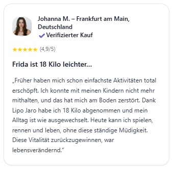 Für nachhaltige und beständige Ergebnisse empfehlen wir, Lipo Jaro mindestens 6 Monate lang anzuwenden. Das ist genau die Zeit, die der Körper benötigt, um das hormonelle Gleichgewicht vollständig wiederherzustellen und den Stoffwechsel-Reset zu festigen.